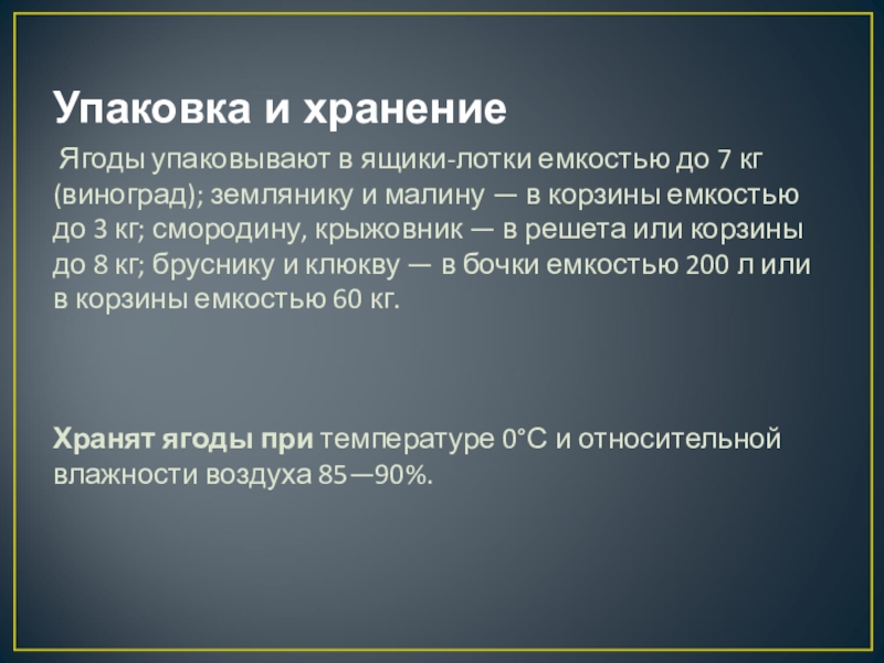(виноград); землянику и малину — в корзины емкостью до 3 кг; смородину, крыжовник — в решета или корзины до 8 кг; бруснику и клюкву — в бочки емкостью 200 л или в корзины емкостью 60 кг.