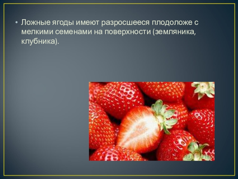 Ложные ягоды имеют разросшееся плодоложе с мелкими семенами на поверхности (земляника,
