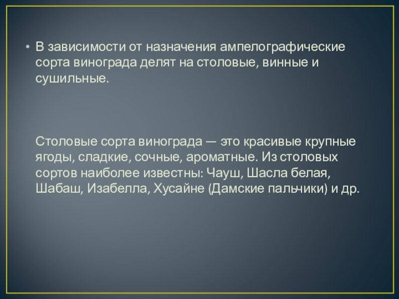 Столовые сорта винограда — это красивые крупные ягоды, сладкие, сочные, ароматные. Из столовых сортов наиболее известны: Чауш, Шасла белая, Шабаш, Изабелла, Хусайне (Дамские пальчики) и др.