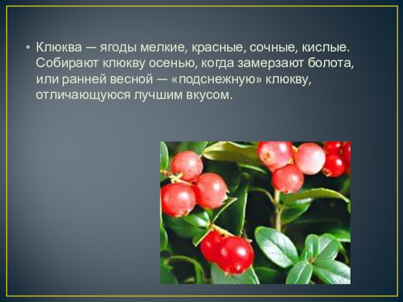 Клюква — ягоды мелкие, красные, сочные, кислые. Собирают клюкву осенью, когда