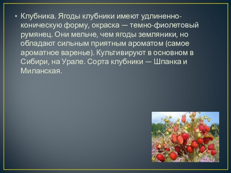 мельче, чем ягоды земляники, но обладают сильным приятным ароматом (самое ароматное варенье). Культивируют в основном в Сибири, на Урале. Сорта клубники — Шпанка и Миланская.