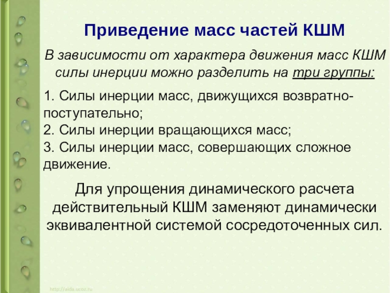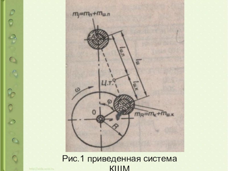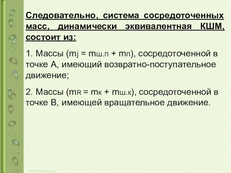 Слайд 10Следовательно, система сосредоточенных масс, динамически эквивалентная КШМ, состоит из: