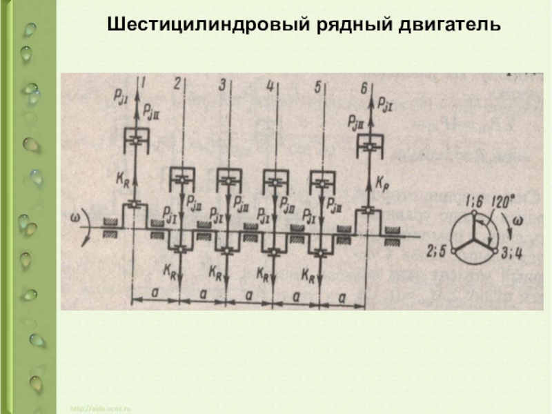 Слайд 39V-образный шестицилиндровый двигатель с углом развала цилиндров 60° и шестью кривошипами
