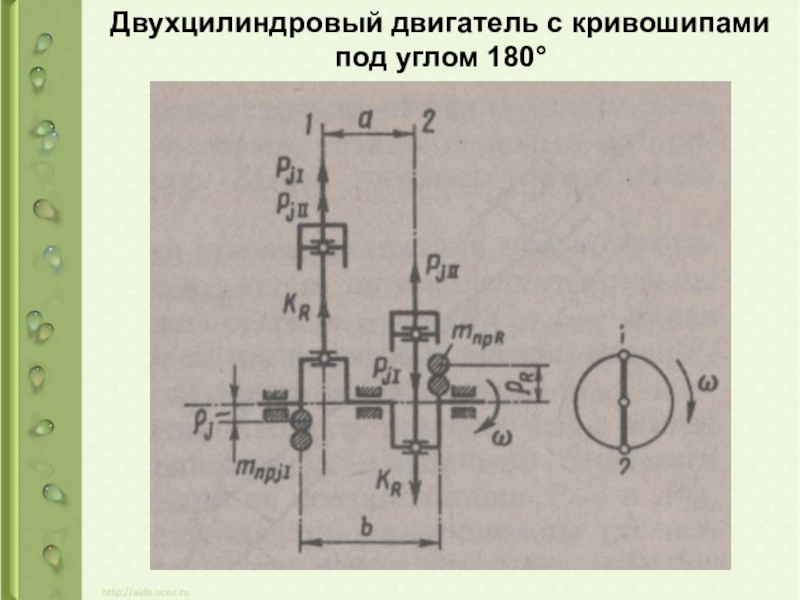 Слайд 31Двухцилиндровый двигатель с кривошипами под углом 180°