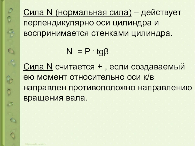 Слайд 15Сила N (нормальная сила) – действует перпендикулярно оси цилиндра и воспринимается