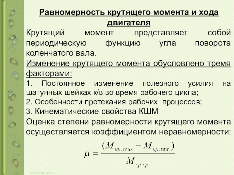 Слайд 45Равномерность крутящего момента и хода двигателя