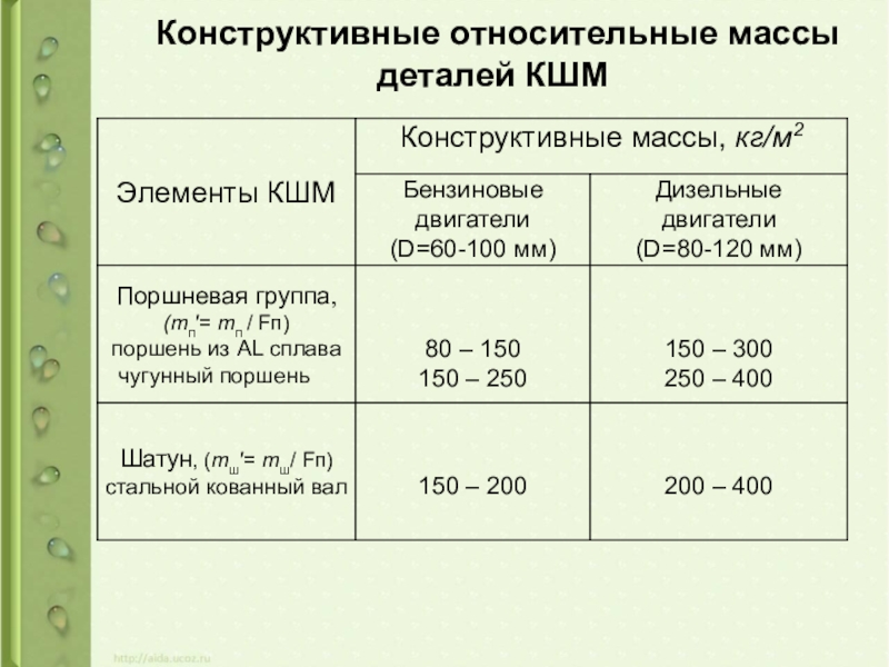 Слайд 11 Конструктивные относительные массы деталей КШМ