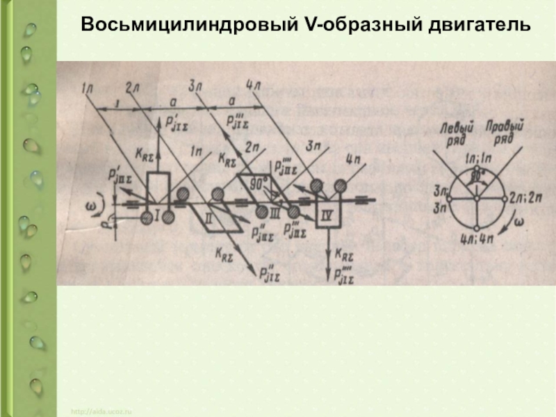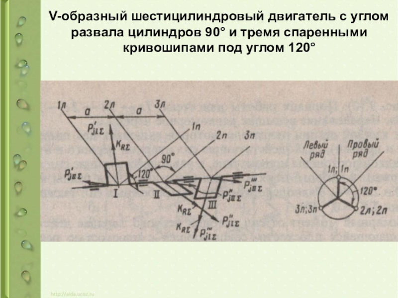 Слайд 37V-образный шестицилиндровый двигатель с углом развала цилиндров 90° и тремя спаренными