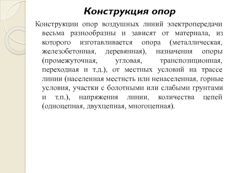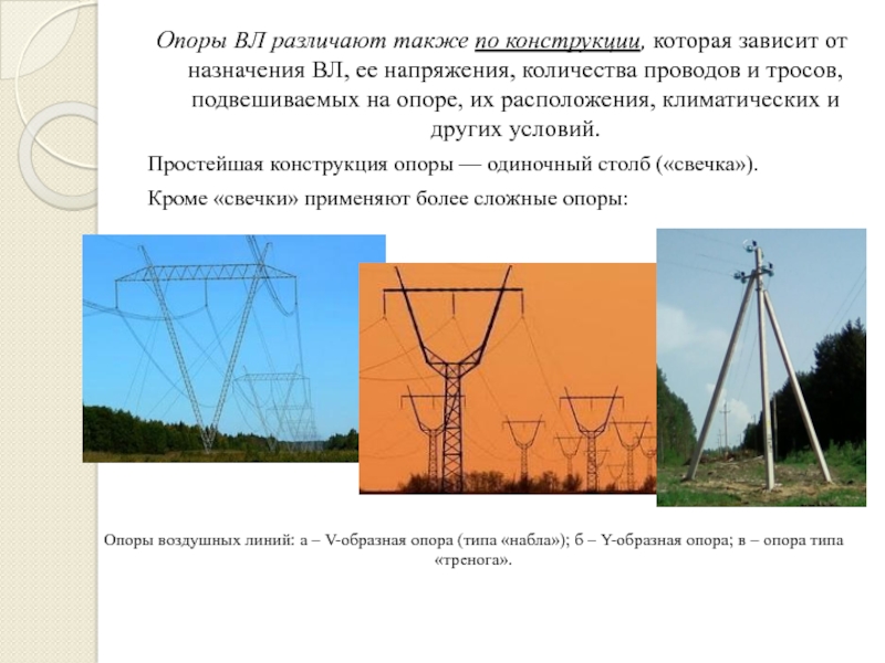 Слайд 20Опоры ВЛ различают также по конструкции, которая зависит от назначения ВЛ, ее