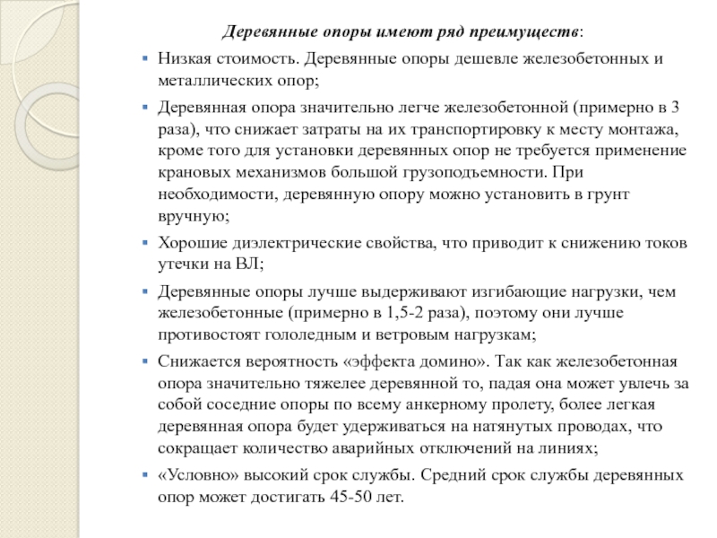 Слайд 12Деревянные опоры имеют ряд преимуществ: