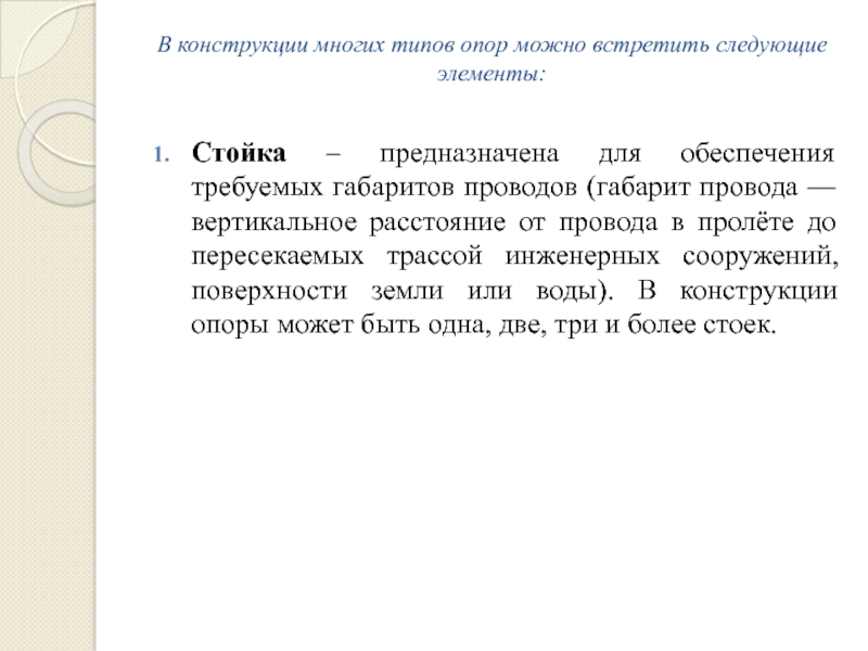 для обеспечения требуемых габаритов проводов (габарит провода — вертикальное расстояние от провода в пролёте до пересекаемых трассой инженерных сооружений, поверхности земли или воды). В конструкции опоры может быть одна, две, три и более стоек.