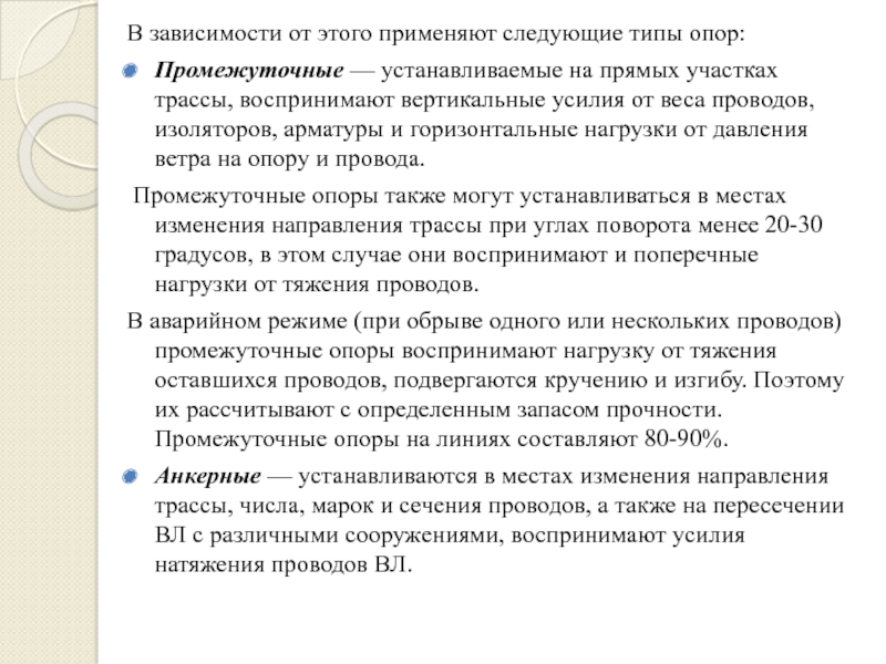 В аварийном режиме (при обрыве одного или нескольких проводов) промежуточные опоры воспринимают нагрузку от тяжения оставшихся проводов, подвергаются кручению и изгибу. Поэтому их рассчитывают с определенным запасом прочности. Промежуточные опоры на линиях составляют 80-90%.