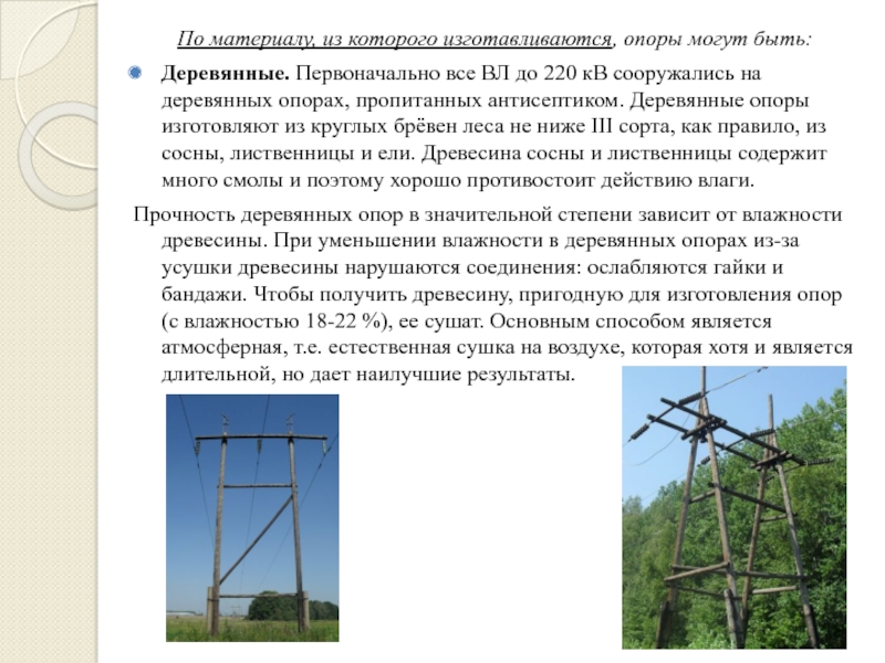 до 220 кВ сооружались на деревянных опорах, пропитанных антисептиком. Деревянные опоры изготовляют из круглых брёвен леса не ниже III сорта, как правило, из сосны, лиственницы и ели. Древесина сосны и лиственницы содержит много смолы и поэтому хорошо противостоит действию влаги.