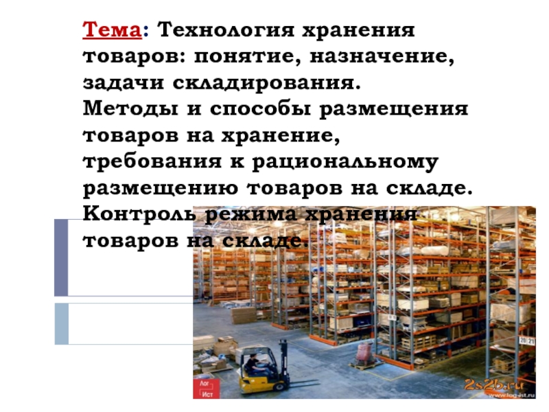 Слайд 2Тема: Технология хранения товаров: понятие, назначение, задачи складирования.