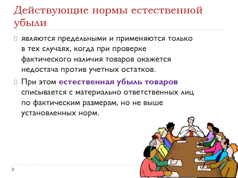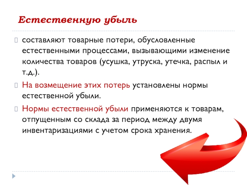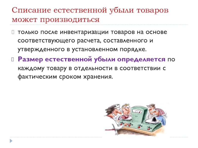 Слайд 27Списание естественной убыли товаров может производиться