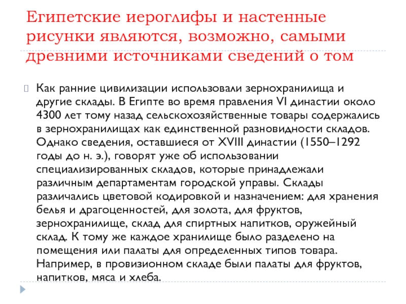 Как ранние цивилизации использовали зернохранилища и другие склады. В Египте во время правления VI династии около 4300 лет тому назад сельскохозяйственные товары содержались в зернохранилищах как единственной разновидности складов. Однако сведения, оставшиеся от XVIII династии (1550–1292 годы до н. э.), говорят уже об использовании специализированных складов, которые принадлежали различным департаментам городской управы. Склады различались цветовой кодировкой и назначением: для хранения белья и драгоценностей, для золота, для фруктов, зернохранилище, склад для спиртных напитков, оружейный склад. К тому же каждое хранилище было разделено на помещения или палаты для определенных типов товара. Например, в провизионном складе были палаты для фруктов, напитков, мяса и хлеба.