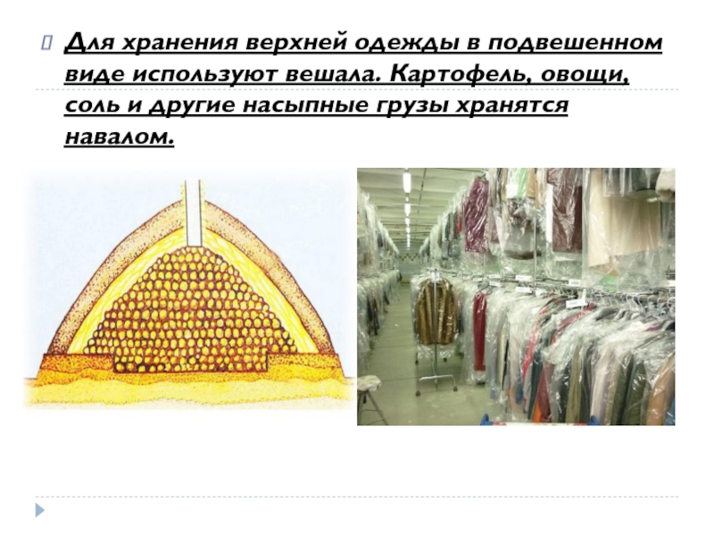 Слайд 23Для хранения верхней одежды в подвешенном виде используют вешала. Картофель, овощи,
