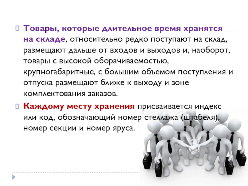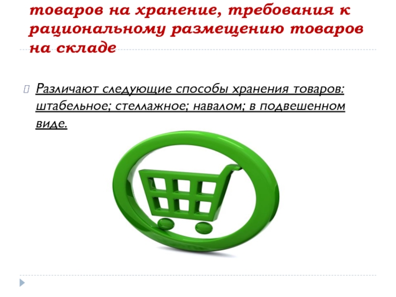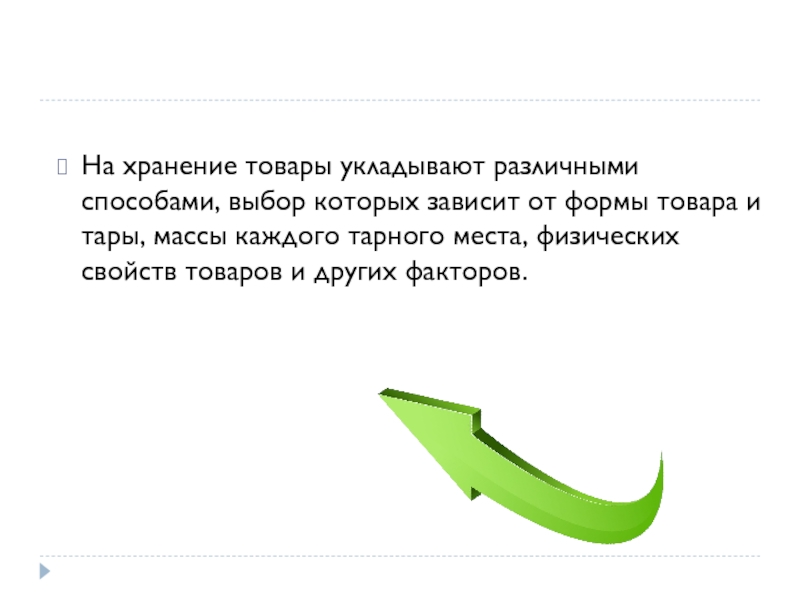 Слайд 13На хранение товары укладывают различными способами, выбор которых зависит от формы