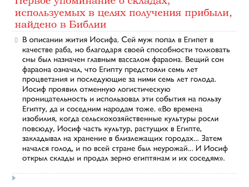 Слайд 7Первое упоминание о складах, используемых в целях получения прибыли, найдено в