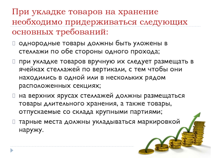 Слайд 22При укладке товаров на хранение необходимо придерживаться следующих основных требований: