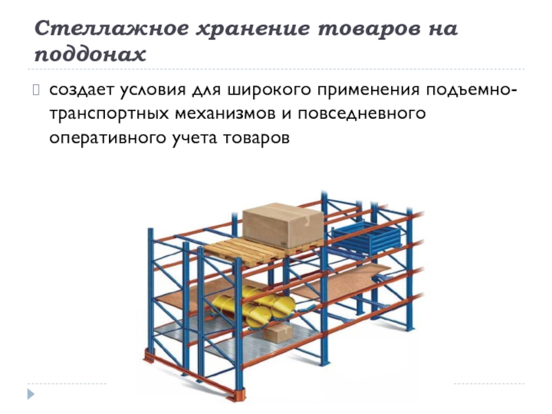 Слайд 19Стеллажное хранение товаров на поддонах
