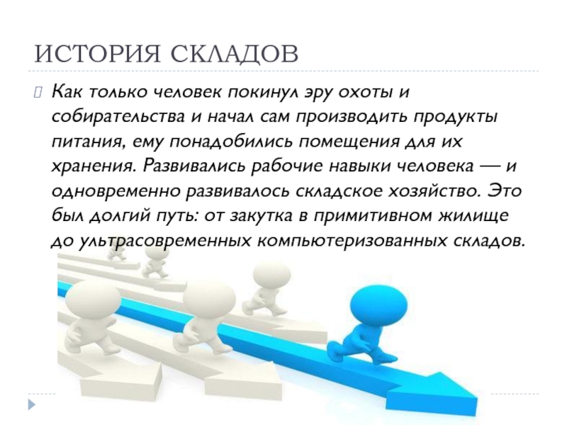 производить продукты питания, ему понадобились помещения для их хранения. Развивались рабочие навыки человека — и одновременно развивалось складское хозяйство. Это был долгий путь: от закутка в примитивном жилище до ультрасовременных компьютеризованных складов.