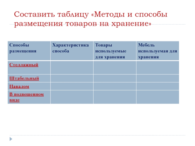 Слайд 30Составить таблицу «Методы и способы размещения товаров на хранение»