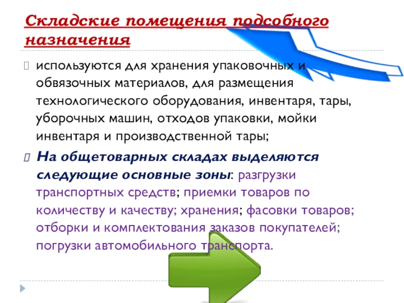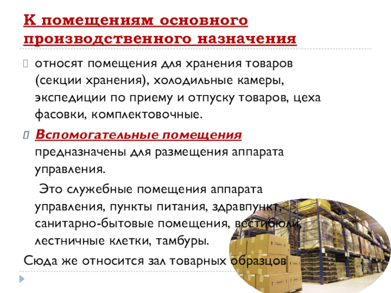 хранения), холодильные камеры, экспедиции по приему и отпуску товаров, цеха фасовки, комплектовочные.