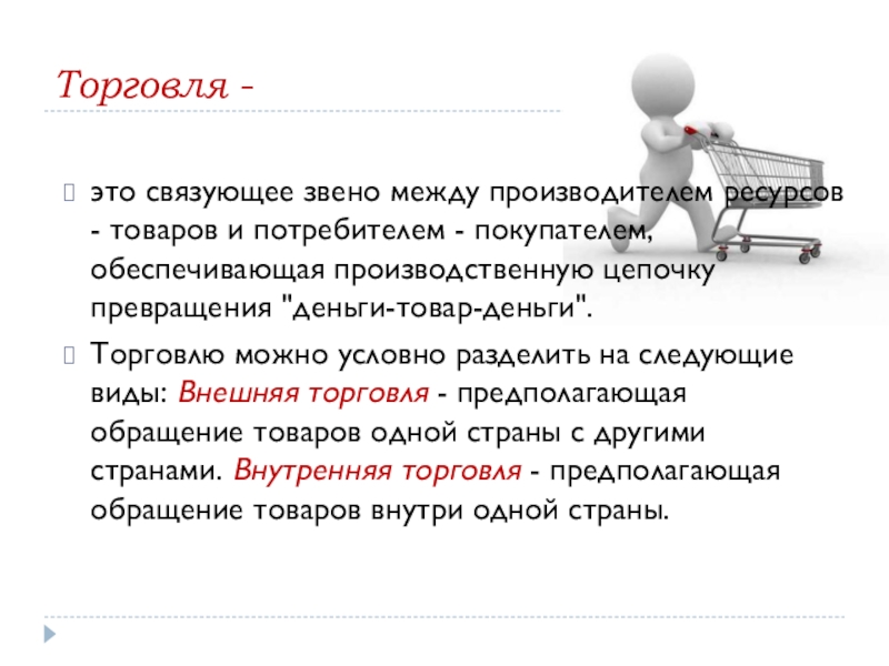 соединяли города и страны, сближали культуру, науку и прогрессивные идеи разных народов. Торговля представляет собой вид деятельности, направленный на извлечение дохода, где объектом действий является товарообмен, купля-продажа товаров, а также сопутствующие дополнительные услуги по обслуживанию покупателей в процессе реализации товаров и обеспечение доставки товаров, их хранения и подготовки к продаже