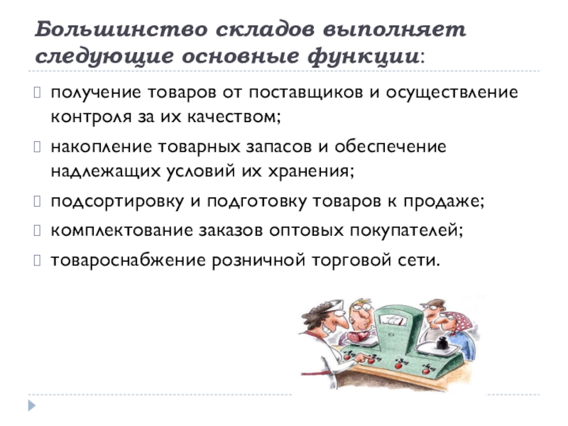 Слайд 15Большинство складов выполняет следующие основные функции: