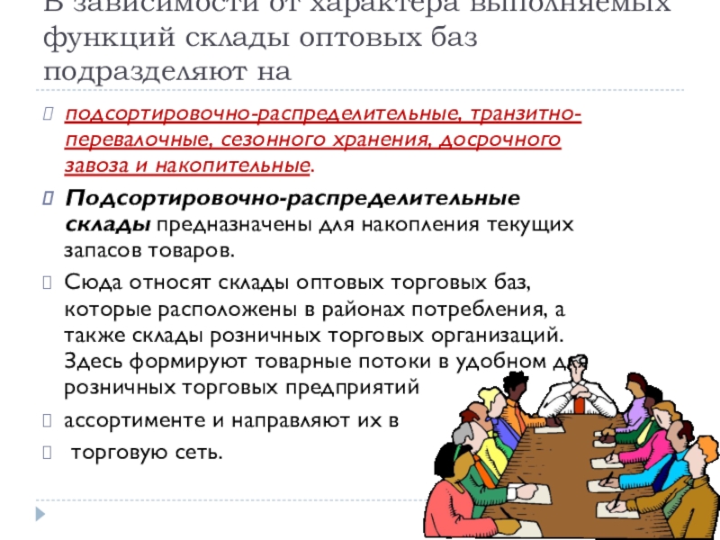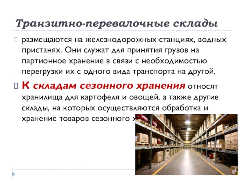подсортировочно-распределительные, транзитно-перевалочные, сезонного хранения, досрочного завоза и накопительные.