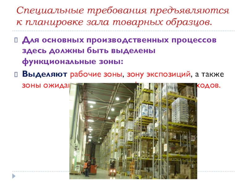 Слайд 28Специальные требования предъявляются к планировке зала товарных образцов.