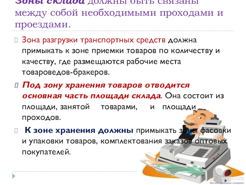 Слайд 27Зоны склада должны быть связаны между собой необходимыми проходами и проездами.