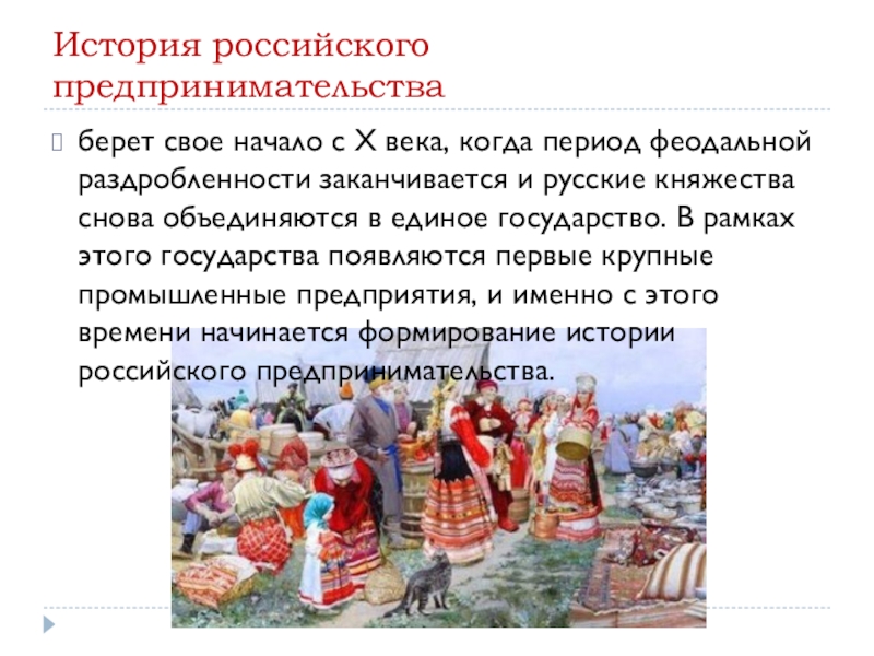 феодальной раздробленности заканчивается и русские княжества снова объединяются в единое государство. В рамках этого государства появляются первые крупные промышленные предприятия, и именно с этого времени начинается формирование истории российского предпринимательства.