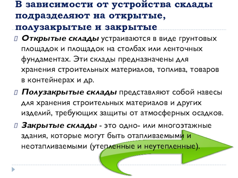 Слайд 23В зависимости от устройства склады подразделяют на открытые, полузакрытые и закрытые