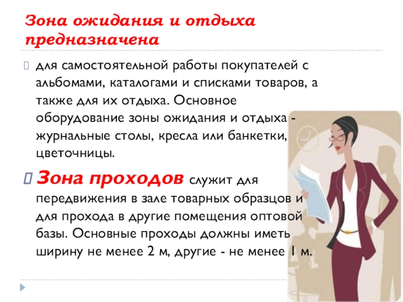 каталогами и списками товаров, а также для их отдыха. Основное оборудование зоны ожидания и отдыха - журнальные столы, кресла или банкетки, цветочницы.