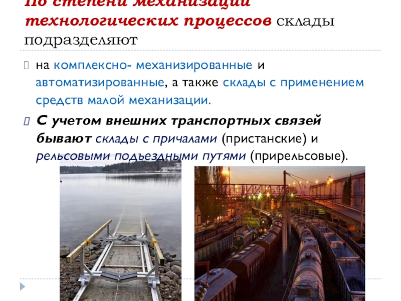 Слайд 22По степени механизации технологических процессов склады подразделяют