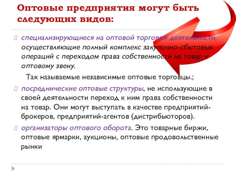 Слайд 13Оптовые предприятия могут быть следующих видов: