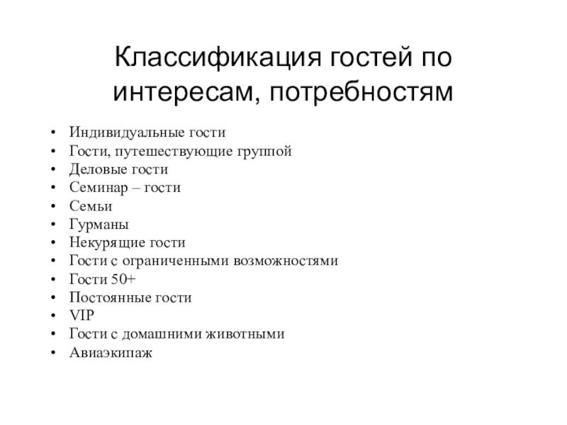 Слайд 6Классификация гостей по интересам, потребностям