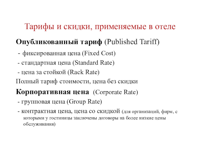 Слайд 21Тарифы и скидки, применяемые в отеле