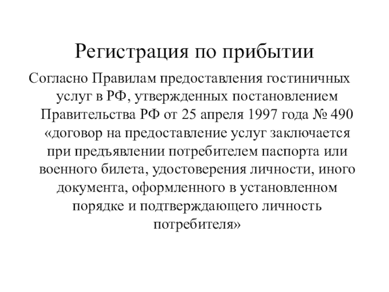 Правительства РФ от 25 апреля 1997 года № 490 «договор на предоставление услуг заключается при предъявлении потребителем паспорта или военного билета, удостоверения личности, иного документа, оформленного в установленном порядке и подтверждающего личность потребителя»