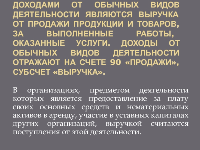 В организациях, предметом деятельности которых является предоставление за плату своих основных средств и нематериальных активов в аренду, участие в уставных капиталах других организаций, выручкой считаются поступления от этой деятельности.