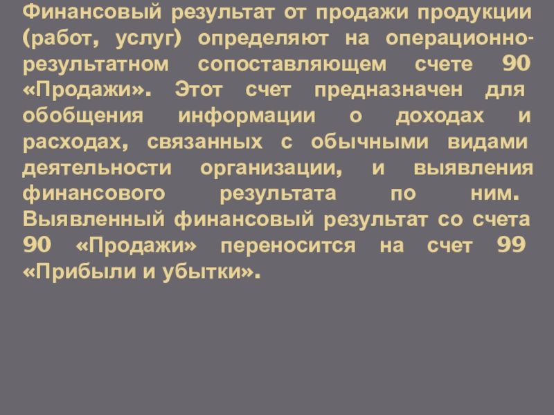 Слайд 19Финансовый результат от продажи продукции(работ, услуг) определяют на операционно-результатном сопоставляющем счете