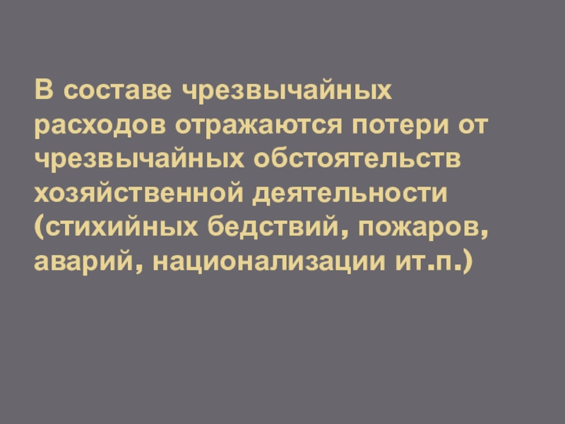 В составе чрезвычайных расходов отражаются потери от чрезвычайных обстоятельств хозяйственной деятельности (стихийных бедствий, пожаров, аварий, национализации ит.п.)