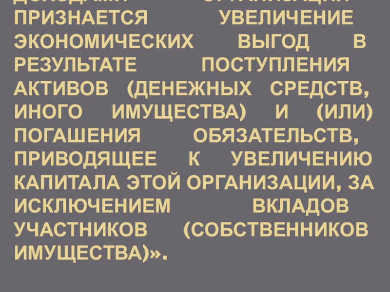 выгод в результате поступления активов (денежных средств, иного имущества) и (или) погашения обязательств, приводящее к увеличению капитала этой организации, за исключением вкладов участников (собственников имущества)».
