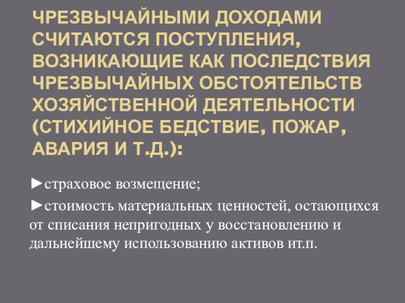 Слайд 11Чрезвычайными доходами считаются поступления, возникающие как последствия чрезвычайных обстоятельств хозяйственной деятельности