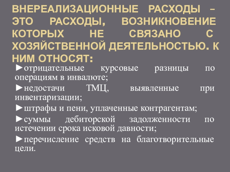 Слайд 16Внереализационные расходы – это расходы, возникновение которых не связано с хозяйственной