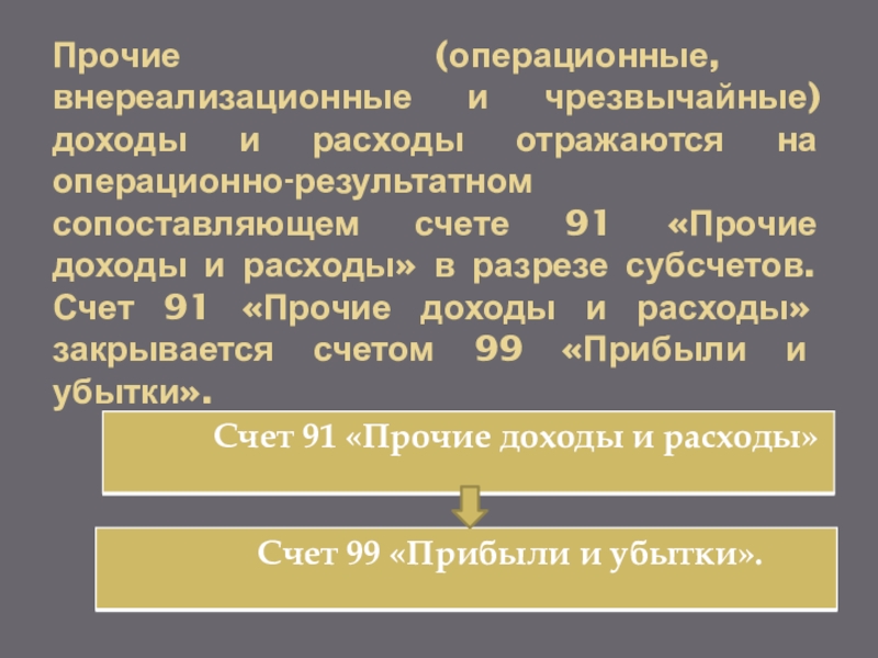 сопоставляющем счете 91 «Прочие доходы и расходы» в разрезе субсчетов. Счет 91 «Прочие доходы и расходы» закрывается счетом 99 «Прибыли и убытки».