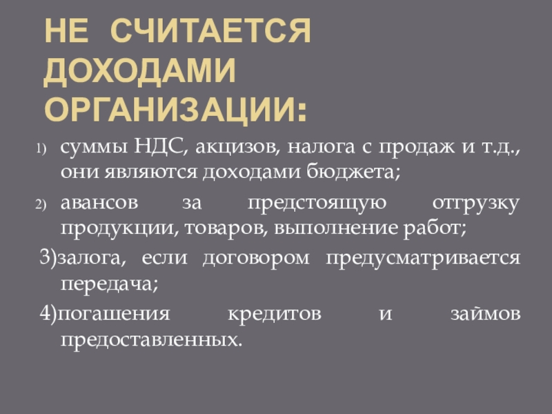 Не считается доходами организации:суммы НДС, акцизов, налога с продаж и т.д., они являются доходами бюджета;авансов за предстоящую