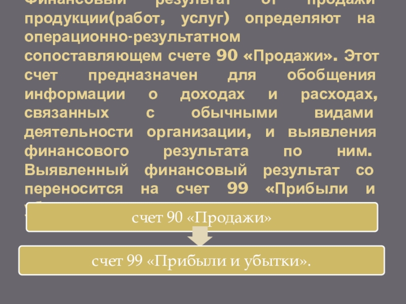 Финансовый результат от продажи продукции(работ, услуг) определяют на операционно-результатном сопоставляющем счете 90 «Продажи». Этот счет предназначен для
